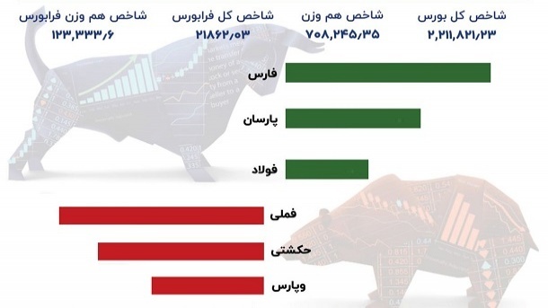 امروز نمادهای فارس، پارسان و فولاد موفق شدند بیشترین اثر مثبت را بر شاخص کل ثبت کنند و در طرف مقابل نمادهای فملی، حکشتی و وپارس بیشترین اثر منفی را بر شاخص ثبت کردند.
