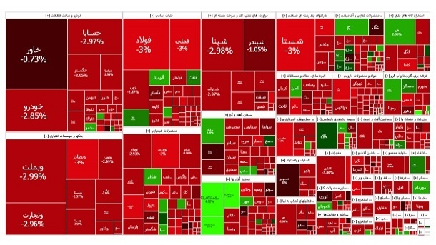 فارس، فملی و فولاد بیشترین تاثیر منفی را بر شاخص بورس داشتند.از نمادهای پرتراکنش نیز میتوان به خودرو، خساپا و فولاد اشاره کرد.