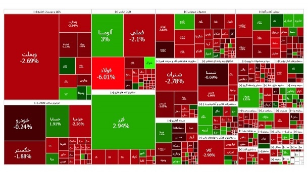 بررسی نمادهای با بیشترین تأثیر منفی بر شاخص کل نشان میدهد «فولاد» با 7426 واحد، «فملی» با 2772 واحد، «شپدیس» با 1980 واحد، «شستا» با 1624 واحد و «فارس» با 1425 واحد بیشترین فشار کاهشی را بر شاخص وارد کردند.