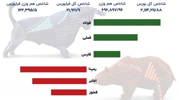 در جریان معاملات امروز بورس، شاخص کل بیش از 14 هزار واحد مثبت شد و در سطح 2 میلیون و 114 هزار واحدی جا خوش کرد. سه نماد شاخصساز فولاد، فملی و فارس به ترتیب با 3700، 2100 و 1390 واحد تاثیر مثبت، سمت و سوی شاخص را به سمت بالا هدایت کردند.