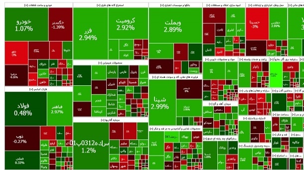 شاخص کل بورس که تا حدود ساعت 11 تا 2 میلیون و 8 هزار واحد سقوط کرد در ادامه توانست بخشی از ریزش خود را جبران کند و در نهایت با 7هزار و 119 واحد افت در محدوده 2میلیون و 17 هزار و 873 واحد به کار خود پایان داد. شاخص هموزن نیز با افت 3هزار و 251 واحدی در محدوده 656 هزار و 492 واحد به کار خود پایان داد. نمادهای فملی، فارس و فولاد بیشترین اثر منفی بر شاخص و نمادهای شپنا، وبملت و شتران بیشترین اثر مثبت بر شاخص را ثبت کردند.