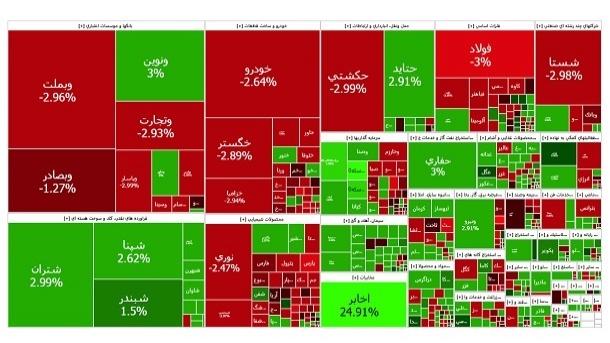 گفتنی است، نمادهای فارس، فولاد، وبملت، شستا، نوری و پارسان، بیشترین، تاثیر بر ریزش و نماد اخابر، بیشترین، تاثیر بر رشد شاخص کل بورس تهران، داشتند.